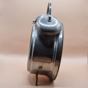Réveil de chevet sans marque de forme ronde avec cloche apparente et de couleur argenté.